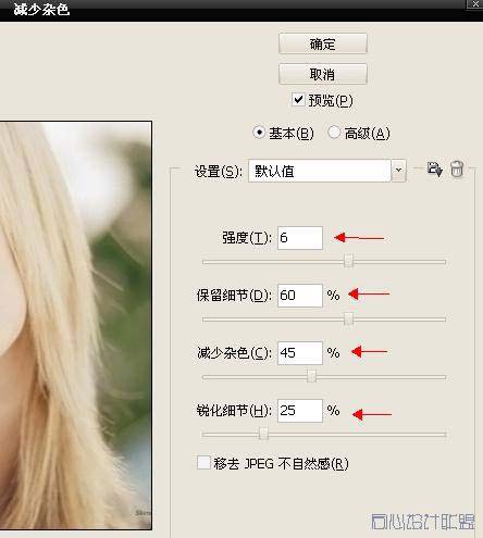 1、将背景层复制一层,并在副本层进行磨皮,使用PS自带的滤镜来磨皮就可以了,执行滤镜-杂色-减少杂色命令,具体参数设置如下图。