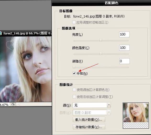 2、人物的皮肤偏红,用匹配颜色命令调整一下,图象-调整-匹配颜色,勾选“中和”,其余数值保持默认。