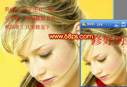 6、人物脸部还有一些痘痘,新建一个图层,盖印图层,选择修复及图章工具修复一下。