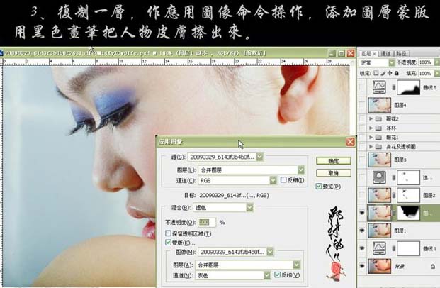 3、把刚才操作的图层复制一层,执行:图像 > 应用图像操作,参数设置如下图,确定后加上图层蒙版用黑色画笔把人物皮肤擦出来。