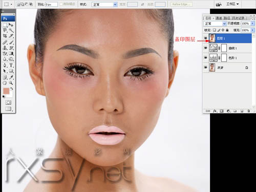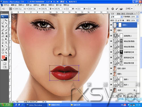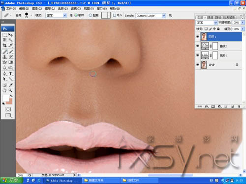 2、由于唇在面部有些抢眼,这里我们选择一张同等角度的唇进行替换,因红色可在保证像素正常的情况下调整到我们需要的色彩。注:原唇色为白色,明度太高,如需其它色彩则要压暗处理,容易出现色彩分离的状况。
