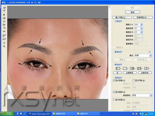 2、眼睛形状的调整,图片中箭头标示的方向则是液化时要提拉的角度。眼睛的液化非常关健,由于眼睛在面部五官中占据了重要的比例关系,我们可遵循三庭五眼的标准来调整。