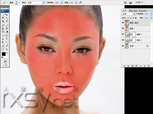 1、观察双侧腮红颜色不够柔和统一,我们来适当调整,新建图层,选择一款接近的颜色,用画笔涂抹,并改图层模式为正片叠底(目的让颜色与皮肤更加服帖),图层蒙版控制边缘过渡。