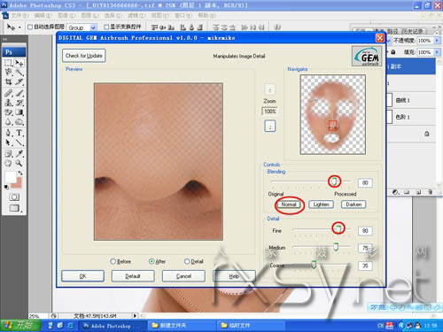 2、这里应用是的柯达磨皮软件,此软件可很好的修整皮肤因明暗不匀所造成的花脸状况。注:相关参数的调整,以确保皮肤不会磨的太平。