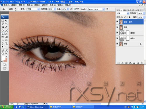 1、 首先对眼部的细节区域进行手动修整,如眼白上的红血丝、过渡不均给人感觉不清澈。注:眼白部分从眼球到眼角方向,是有一定的明暗过渡的,修整时颜色避免一致,否则很假。