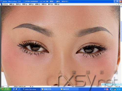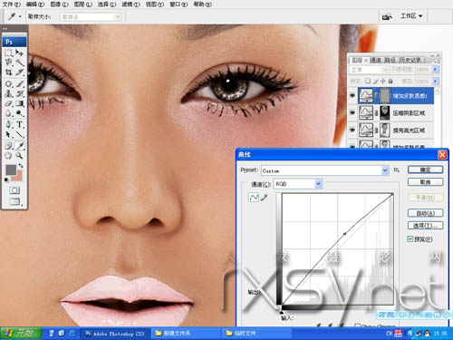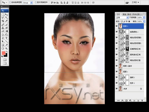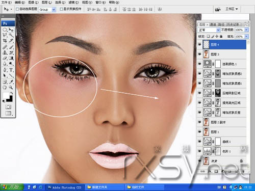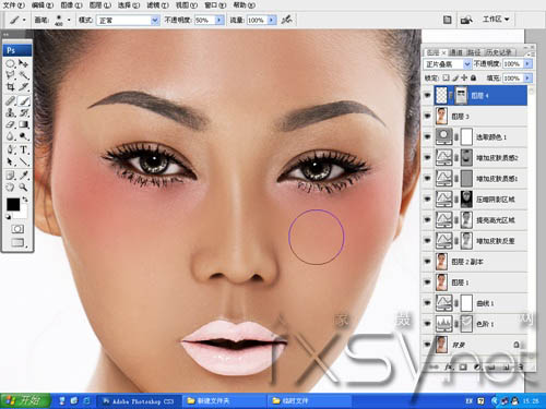 接下来主要是对皮肤的修饰,修整皮肤有很多种方法,不管是什么方法只要能达到好的最终结果则都是可取的,这里我们结合了磨皮软件,细节区域可单独处理。