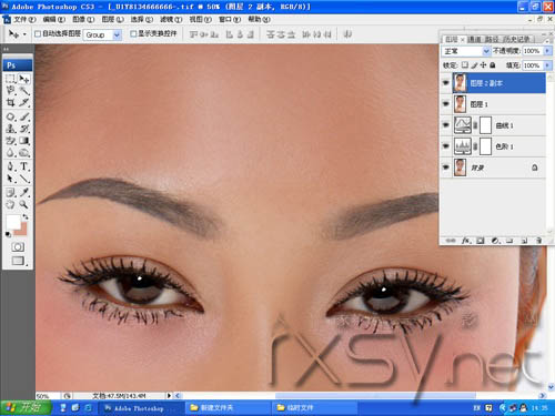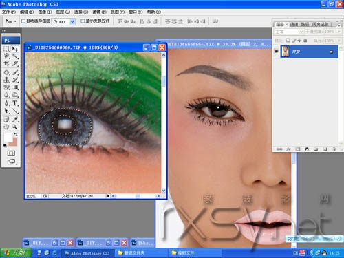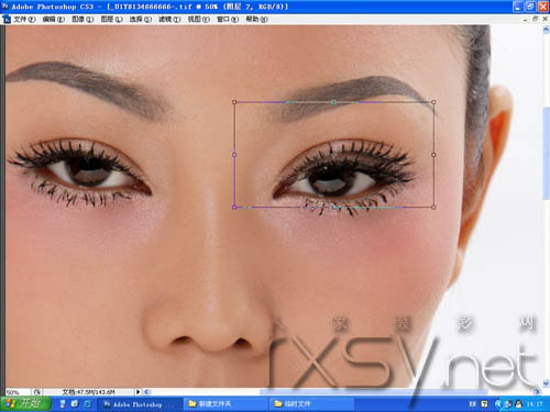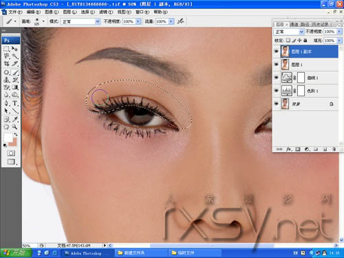 2、观察两眼双眼皮的形状,右侧双眼皮不够标准,睫毛也不够明显,如果采用真接修整的方法则会比较麻烦,所以我们可考虑将左侧的睫毛加双眼皮复制到右侧,首先将左侧进行选中并复制。