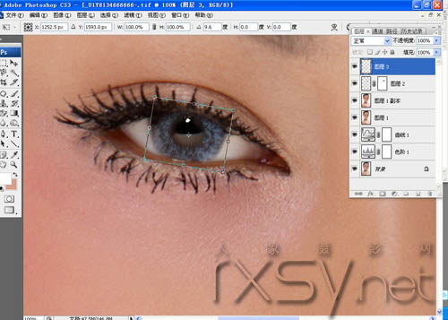 5、为了使眼球更具有层次感,我们通过添加美瞳来实现,常见的美瞳有各种颜色的,纹理以放射状居多,同时具有放大眼球的效果。这里我们选择现有美瞳的眼睛进行复制,最好是同一角度的,适当变换调整使其相匹配。注:复制时只选择瞳孔外侧的区域即可,不需要将整个眼球全部复制。
