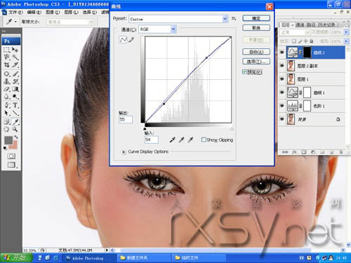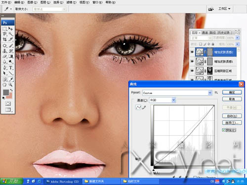 4、 对刚才选区进行反选,选中毛孔阴影进行压暗,通过这种方式来使每个毛孔的对比加大,整体质感刚会达到强化的效果。注:注意曲线调整的幅度,否则毛孔对比太大,使皮肤看起来很脏
