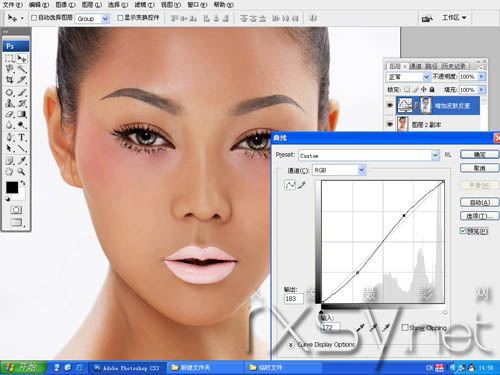 1、查看色阶,直方图中显示阴影及高光区域缺少像素,所以致使皮肤发灰,我们适当调整,使照片恢复正常的黑白对比。然后再利用曲线(图层<新建调整图层)为照片提亮,主要针对皮肤部分,在提亮之前可在皮肤上点击查看对应皮肤的斜线节点位置再做调整,暗部明暗不变。