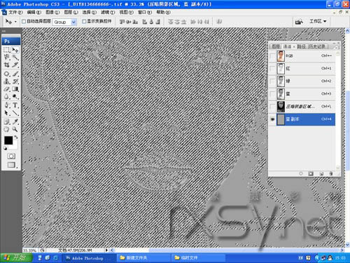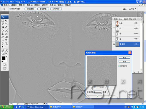 2、 接下来我们这步主要为了加强皮肤质感,复制蓝通道并做高反差保留,半径10像素左右,此步可将面部毛孔的高光及阴影计算出来,以便单独调整。