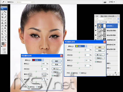 5、 当皮肤中红色居多时则会显的皮肤有焦糊感,这里利用可选颜色,把皮肤中的红色和黄色数值进行适当降低。注:可选颜色:青色+45,黄色-14,可根据具体情况适当调节。