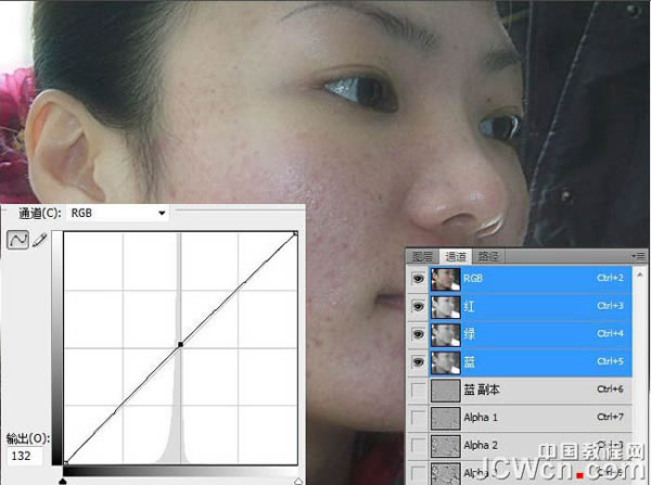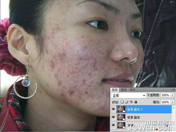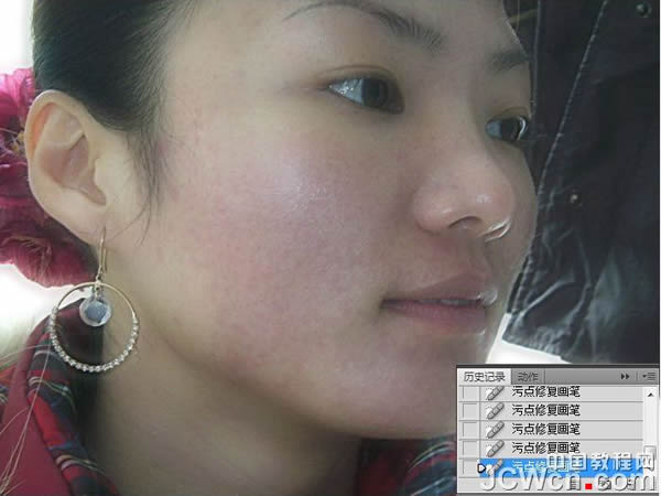 12、(不要取消选择),用图章、污点修复画笔等工具清除剩余的斑点。选区内的斑点去除后,取消选择,清除亮斑(第8—12步操作,就是现在常用的通道法磨皮)。
