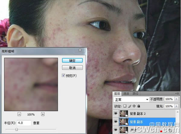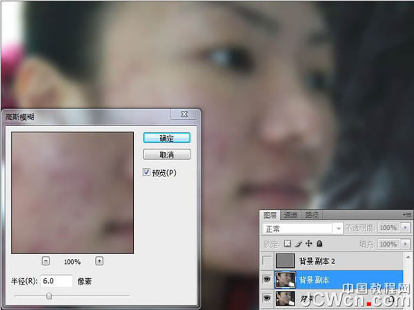 5、以下的调整就没有固定套路了,应根据图片的具体情况,采用不同的方法。大致的思路是:低频层调颜色,清除色斑,高频层调细节。先调低频层,(为便于观察,可关闭高频层),选图层副本,高斯模糊6像素。