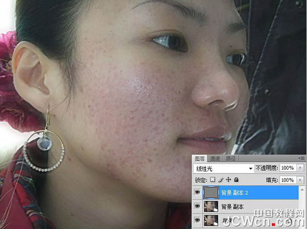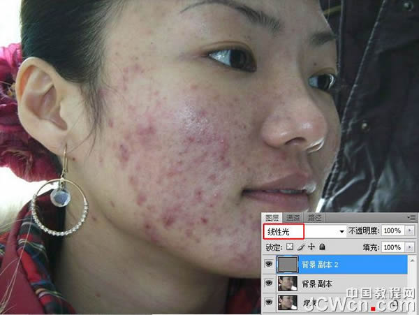 4、更改图层混合模式为线性光。至此,我们就建立了高频(图层副本2)、低频(图层副本)两个图层。