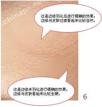 6、羽化后进行模糊的效果边缘与皮肤过渡看起来比较自然,对比效果如下图。