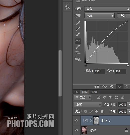 由通道转入图层, 并创建曲线调整图层, 在曲线中点垂直向上拉半格。