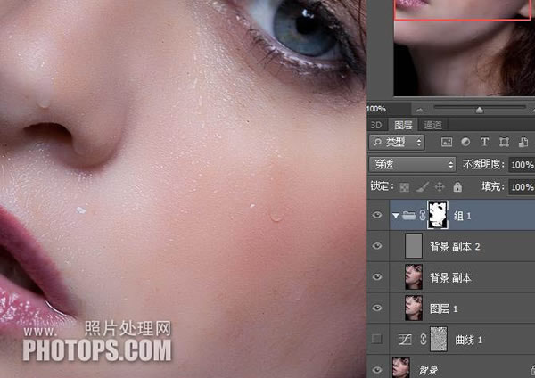 11、将图层 1( 通道计算去斑层) , 背景副本 ( 表面模糊层) 和背景副本 2 ( 红通道的高反差保流层) 合并为组 1,图层模式为穿透, 并加上黑色蒙板。