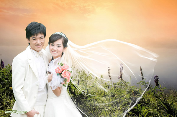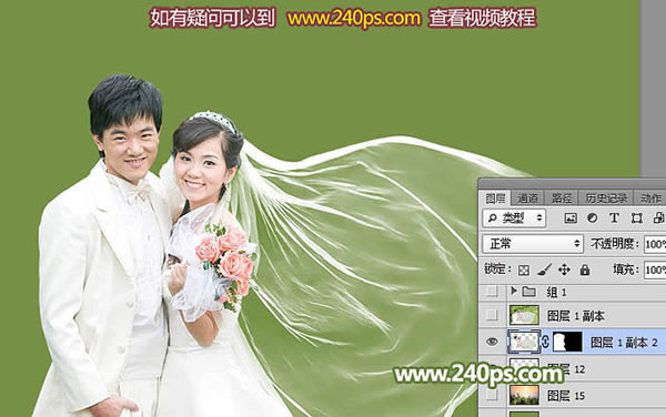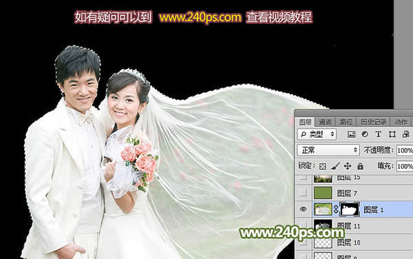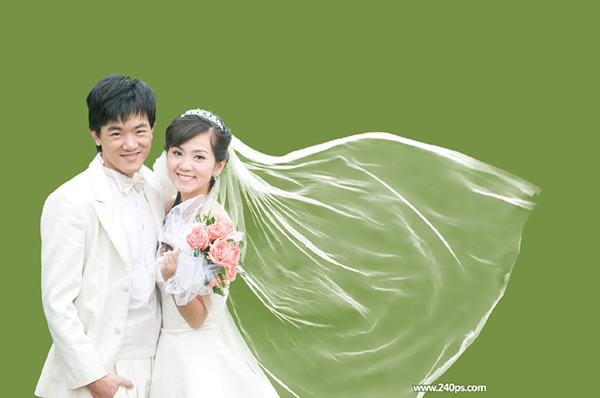 22、把顶部抠出的人物图层显示出来,在蒙版上用柔边黑色画笔把飘纱部分擦出来,如下图。