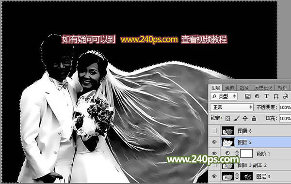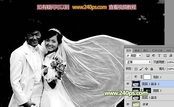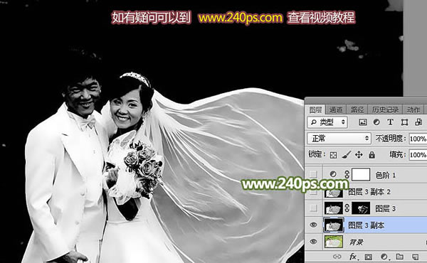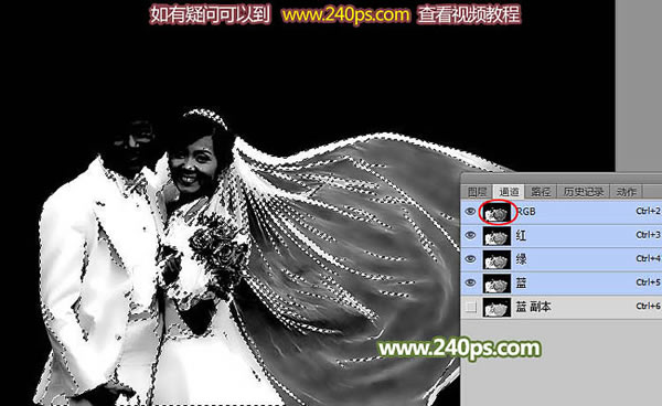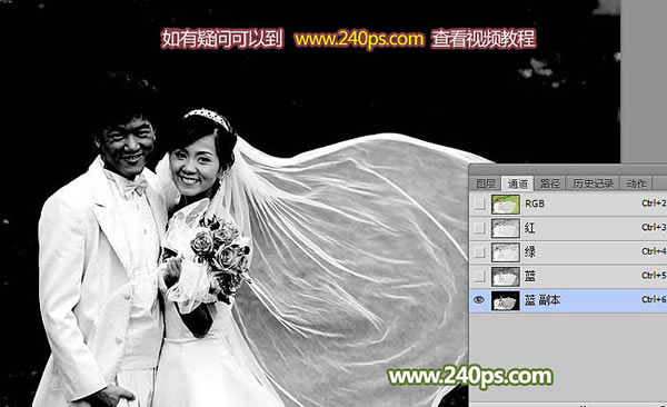 3、按Ctrl + A 把蓝副本通道全选,按Ctrl + C 复制,点RGB通道返回图层面板,新建一个图层,按Ctrl + V 粘贴,效果如下图。后面的操作比较复杂新手最好到240ps.com视频栏目查看视频教程。