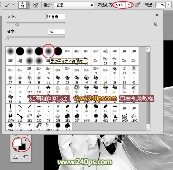 8、把前景色设置为白色,选择画笔工具,在画笔预设里面找一款柔边圆形画笔,画笔不透明度设置为50%,如下图。