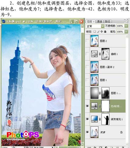 2、创建色相/饱和度调整图层,选择全图,饱和度为:33;红色:饱和度为7;青色:饱和度为:-42,明度为:-9。