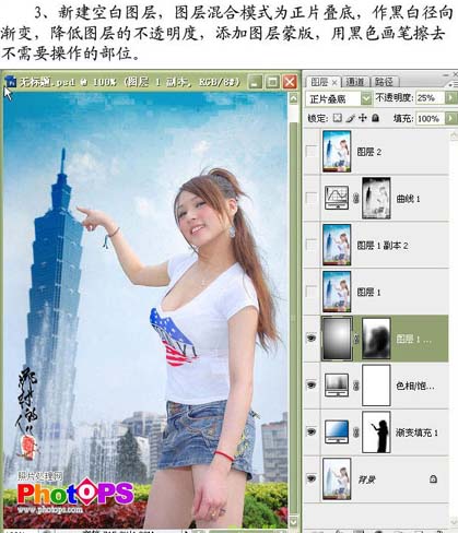 3、新建一个空白图层,图层混合模式改为“正片叠底”,做黑白径向渐变,然后把图层不透明度改为:25%,加上图层蒙版用黑色画笔擦去不需要操作的部位。