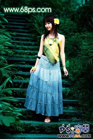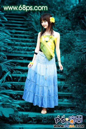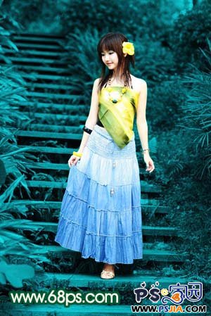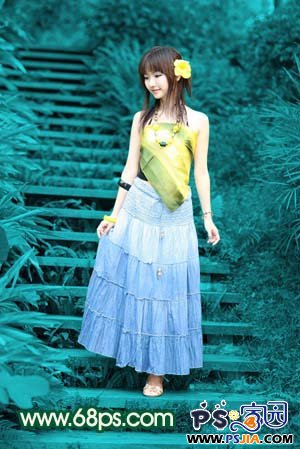 1、打开原图素材,创建色相/饱和度调整图层,参数设置如图1,勾选“着色”,确定后用黑色画笔把人物部分擦出来,效果如图2。