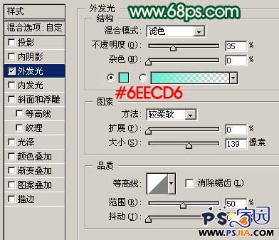 7、双击图层面板,蝴蝶图层缩略图调出图层样式,设置外发光,参数设置如图11,确定后把图层混合模式改为“滤色”,图层不透明度改为:70%,效果如图12。