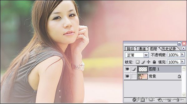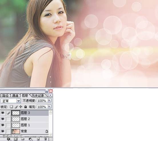 7.光斑还是很生硬,为了使光斑梦幻,层次丰富,我们使用滤镜——高斯模糊(半径3),然后再新建两个图层,按照同样的方法图层3画出光斑(画笔比第一次要小一些,模糊半径1),图层1画笔再小一点,不需要模糊!效果已经出来了!