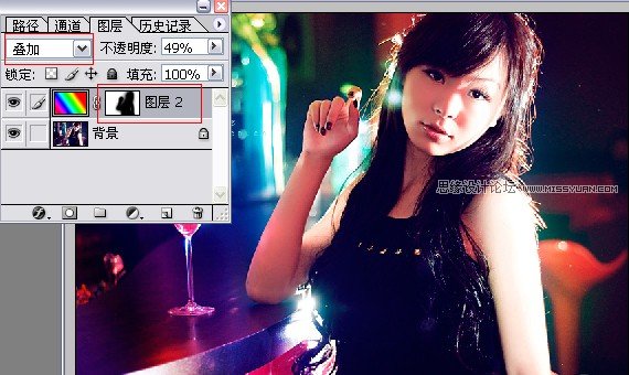 1、打开图片,新建一个图层,模式为叠加,用渐变工具拉一个45度的线性渐变填充在图层2上.,利用蒙板擦出人像