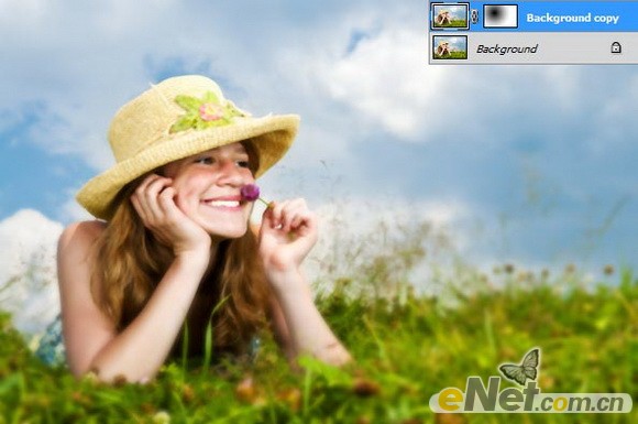 4、添加一个图层蒙版。在蒙板上用画笔在人物上涂抹至人物清晰。