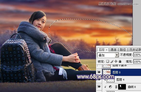 21、新建一个图层,用套索工具勾出下图所示的选区,羽化55个像素后填充红褐色:#B26841,取消选区后把混合模式改为“叠加”,效果如下图。
