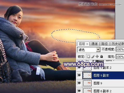 24、新建一个图层,用套索工具勾出下图所示的选区,羽化35个像素后填充橙红色:#D7703F,取消选区后把混合模式改为“滤色”,效果如下图。