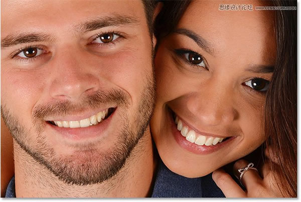 将照片放大,我们看到两个人在他们的牙齿上都显示出一点黄色。我们可以美白他: